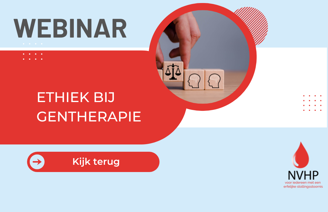 De NVHP organiseerde op 18 januari een webinar ethiek bij gentherapie voor hemofilie. Onder andere de behoefte aan autonomie, de afweging tussen de risico’s en de voordelen en de onzekerheden eromheen kwamen aan bod. Ook ‘de belofte van genezing’ kwam ter sprake. Want wat houdt genezing van hemofilie eigenlijk in? De presentatie is hieronder terug te kijken.